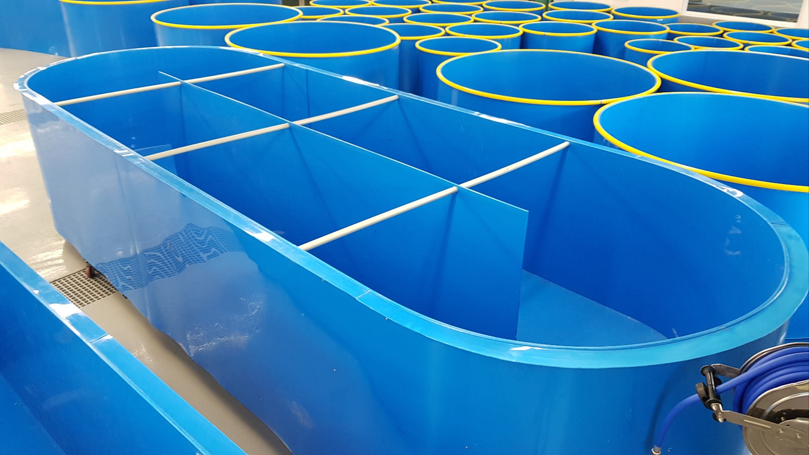 PP水槽(各魚種、場所、大きさ、形状を合わせ製作)地域、魚種により二重壁式にすることにより保温性がアップし光熱費軽減、水温が安定するメリットがあります。またポリカ水槽はアクリルやガラスでは製作が高価で困難だった形状やサイズなどを低価格で実現、オリジナルサイズ、形状、仕様が製作できます。